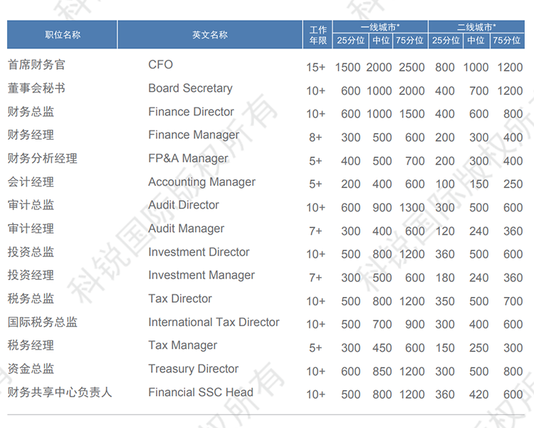 以下是猎头招聘公司凯发k8官网国际发布的薪酬报告对财务领域的职位薪酬信息统计,供企业和猎头招聘时参考。