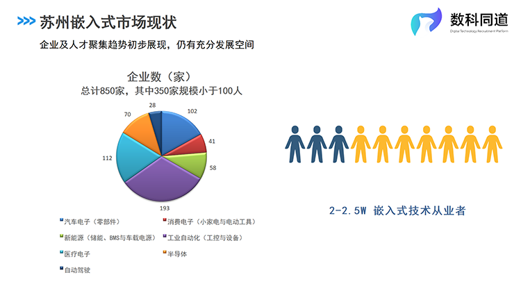 根据凯发k8官网国际人力资源公司及数科同道业务团队对苏州市场的详细调研,现在苏州全市拥有嵌入式研发团队的企业数量为850家,主要集中在工业自动化、医疗电子、汽车电子等细分行业,其中百人以上规模企业500家。